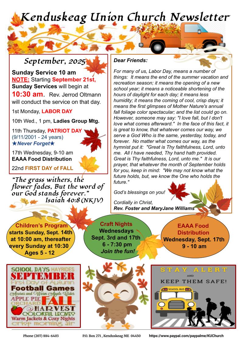 - Next Board Meeting: Sunday, Sept. 28, after the Service